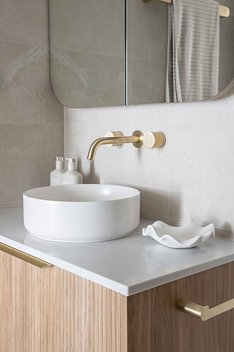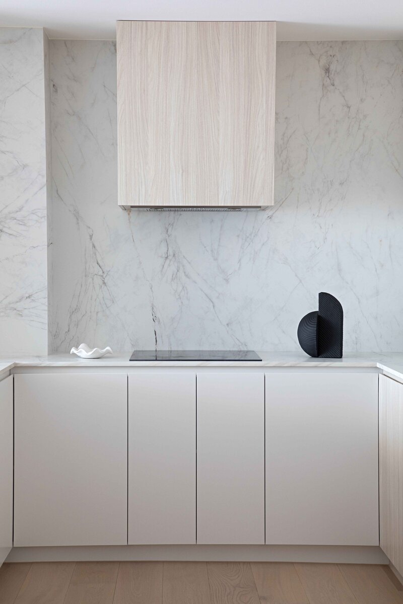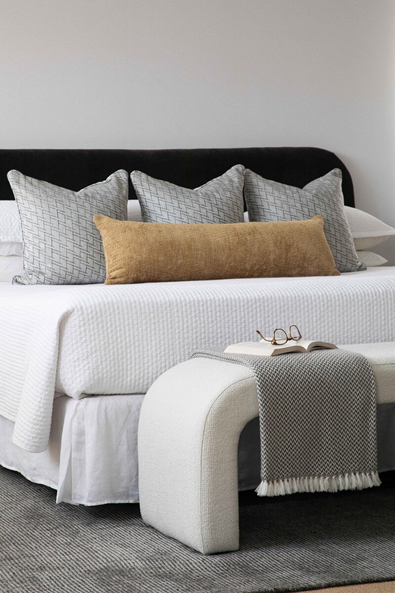 This was a full interior design service, where I was engaged to completely reimagine the apartment and transform it into a light, serene retreat from city life. The original layout felt boxed in with outdated finishes, a disconnected kitchen, and limited storage. Walls were removed to create better flow between the kitchen, bar and dining area, while the bathrooms were completely reconfigured for a more practical, streamlined layout. A built-in laundry was also integrated for added functionality. The bedrooms were designed to feel cocoon-like and restorative, featuring luxurious wool carpets underfoot and custom-designed headboards. Clever storage solutions and soft layering brought both form and function to these spaces — elevating comfort without compromising on practicality. Every surface was considered — from new flooring and a refined paint scheme to curated furniture and thoughtful styling. The brief called for the elegance and luxury of a hotel, balanced with the warmth and comfort of home.