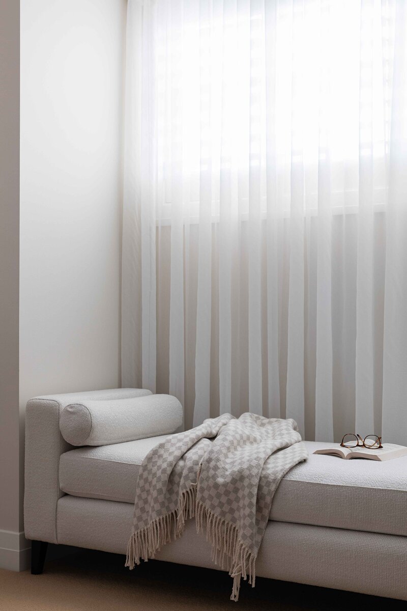 With the architecture of the home being sleek and streamline the objective for the interior was to be soft, inviting and provide a sense of visual warmth without the clutter. This was achieved with a beautiful backdrop of sheer curtains, curved elements and contrasting layered textures whilst a gentle play on colour.